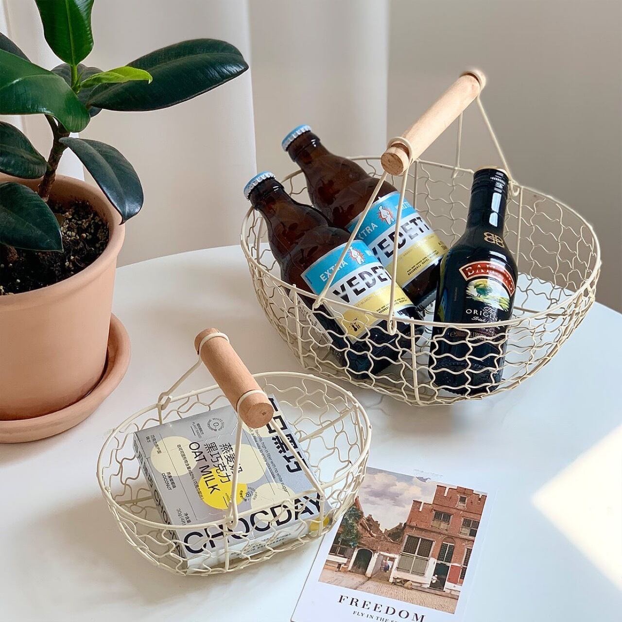○持ち手部分が木製になっている、ホワイトカラーのワイヤーバスケットです。